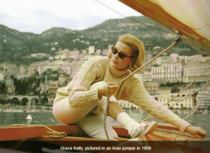 Even earlier in time, back in the 1950’s, a now famous photograph of the beautiful and stylish Grace Kelly wearing an Aran sweater came to light. Not long afterwards in 1956 Grace Kelly featured on the cover of the Vogue magazine wearing an Aran sweater and then shortly afterwards she was photographed sporting a similar, cream, roll neck Aran jumper on board a yacht.